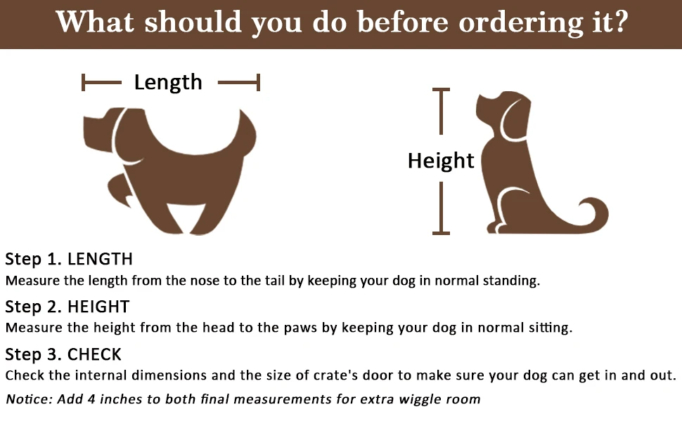 *Be sure to properly measure your dog, and add 4″ to their L x H for extra wiggle room 🙂
